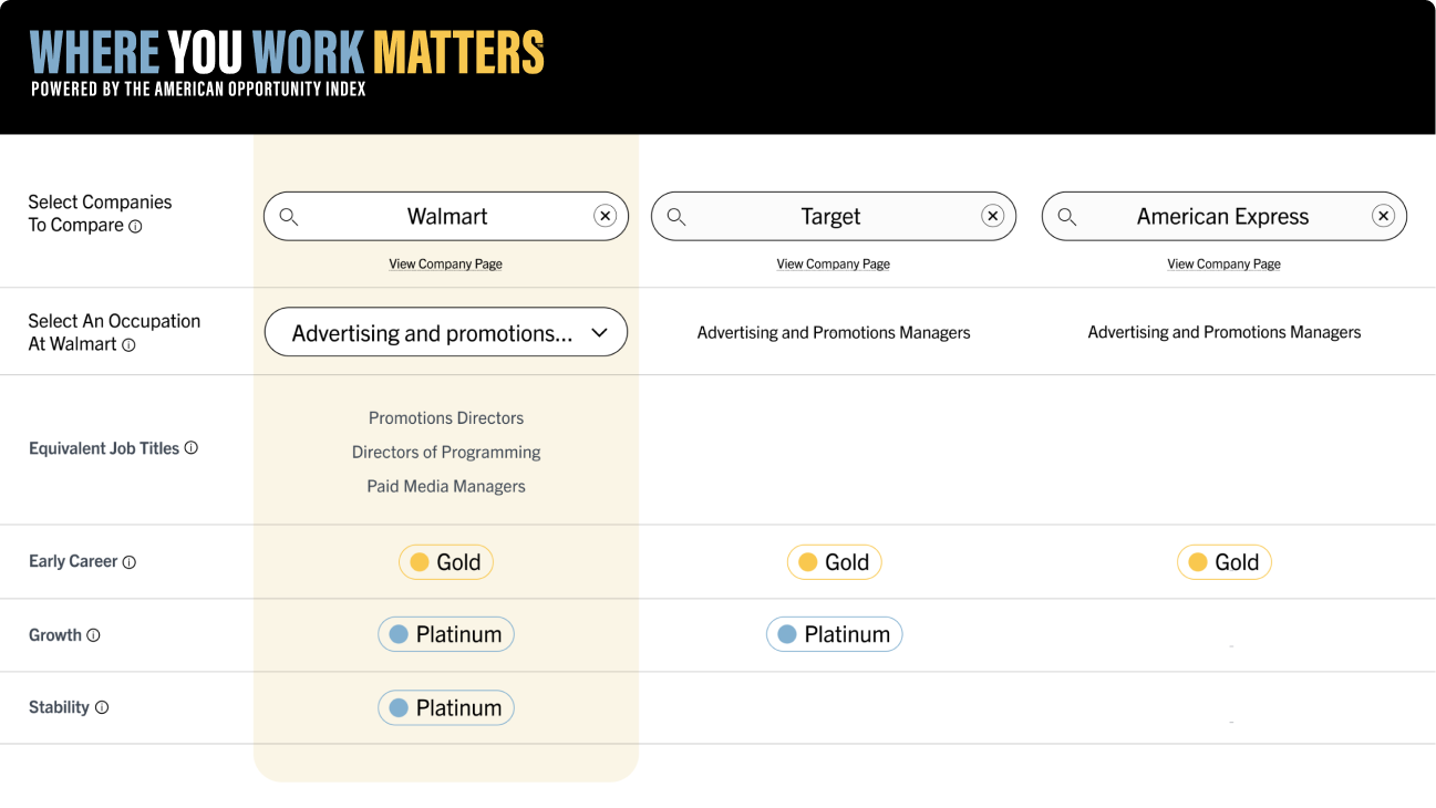 Where You Work Matters List is an independent rating of how well the largest U.S. employers are creating high-quality jobs. The List reveals the companies doing best overall at creating jobs that enable workers to advance in their careers, receive leading wages and be retained in their roles. Most significantly, the List shows how well employers do this by specific occupations in their workforce—information that has not previously been available to workers or businesses.